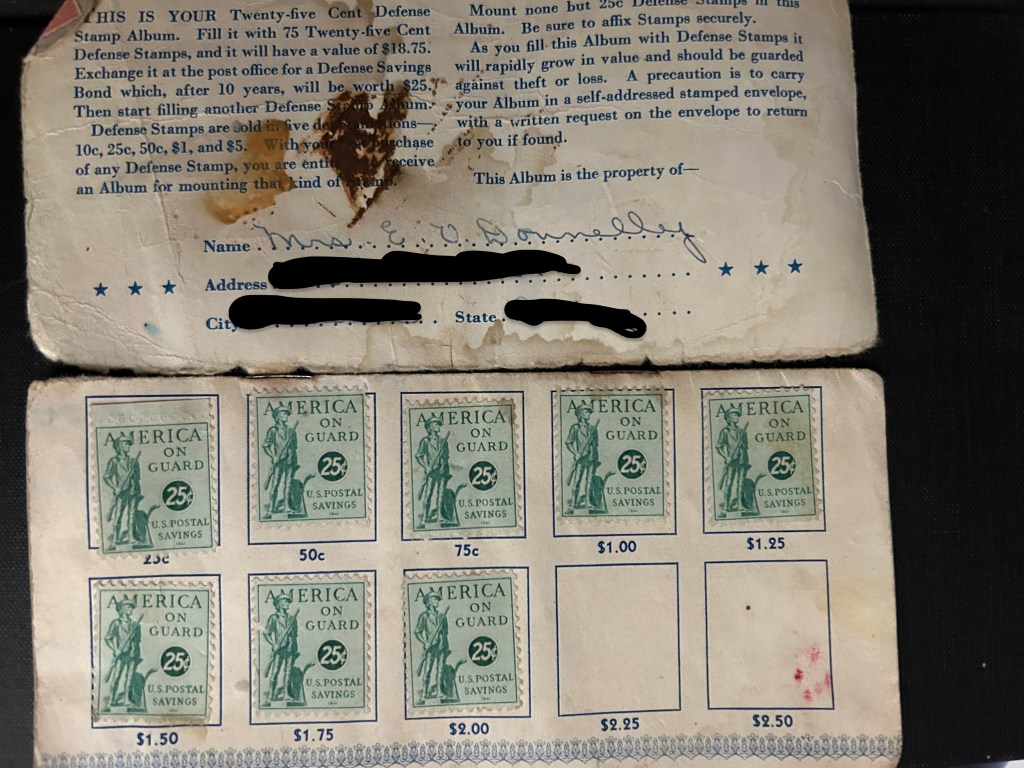 Of all the artifacts that we recovered then, I decided it would be good to see if I could turn in the stamps my great-grandmother, or G.G. as my cousins & I called her, for anything today. Surely, over 80 years they would have gained some monetary value. My first stop was to my local bank branch, where I took them to the counter and with a smile explained my unusual visit. The tellers who were working that afternoon gathered at the window to look at the album, having never seen its kind before. One read the fine print and suggested that I needed to go to the local post office first and see if the Postal Service still would collect these stamp albums in exchange for savings bonds. After all, if the coins and bills of the U.S. Dollar don’t expire, then why should this stamp album that could be exchanged for savings bonds expire?[1]