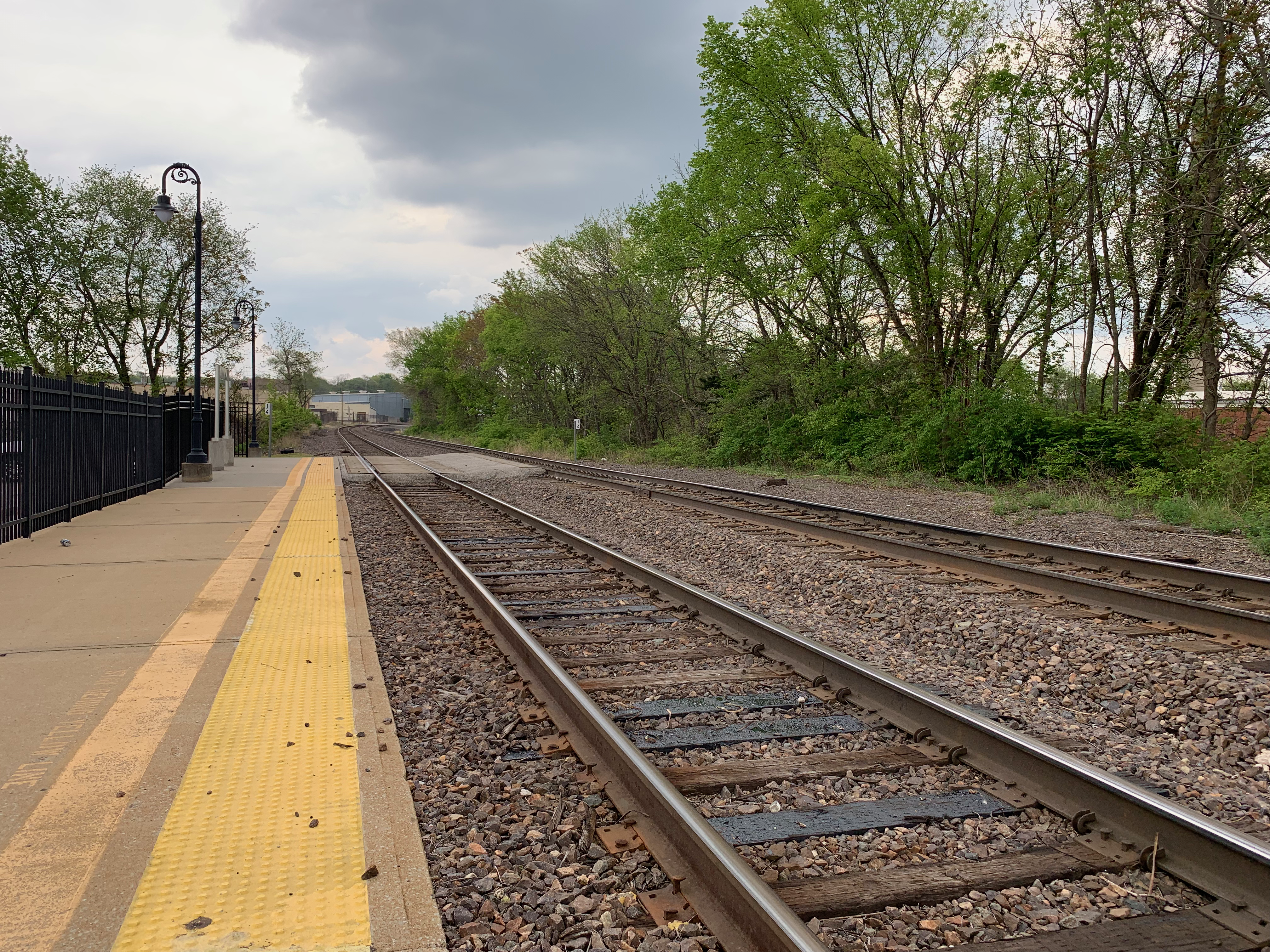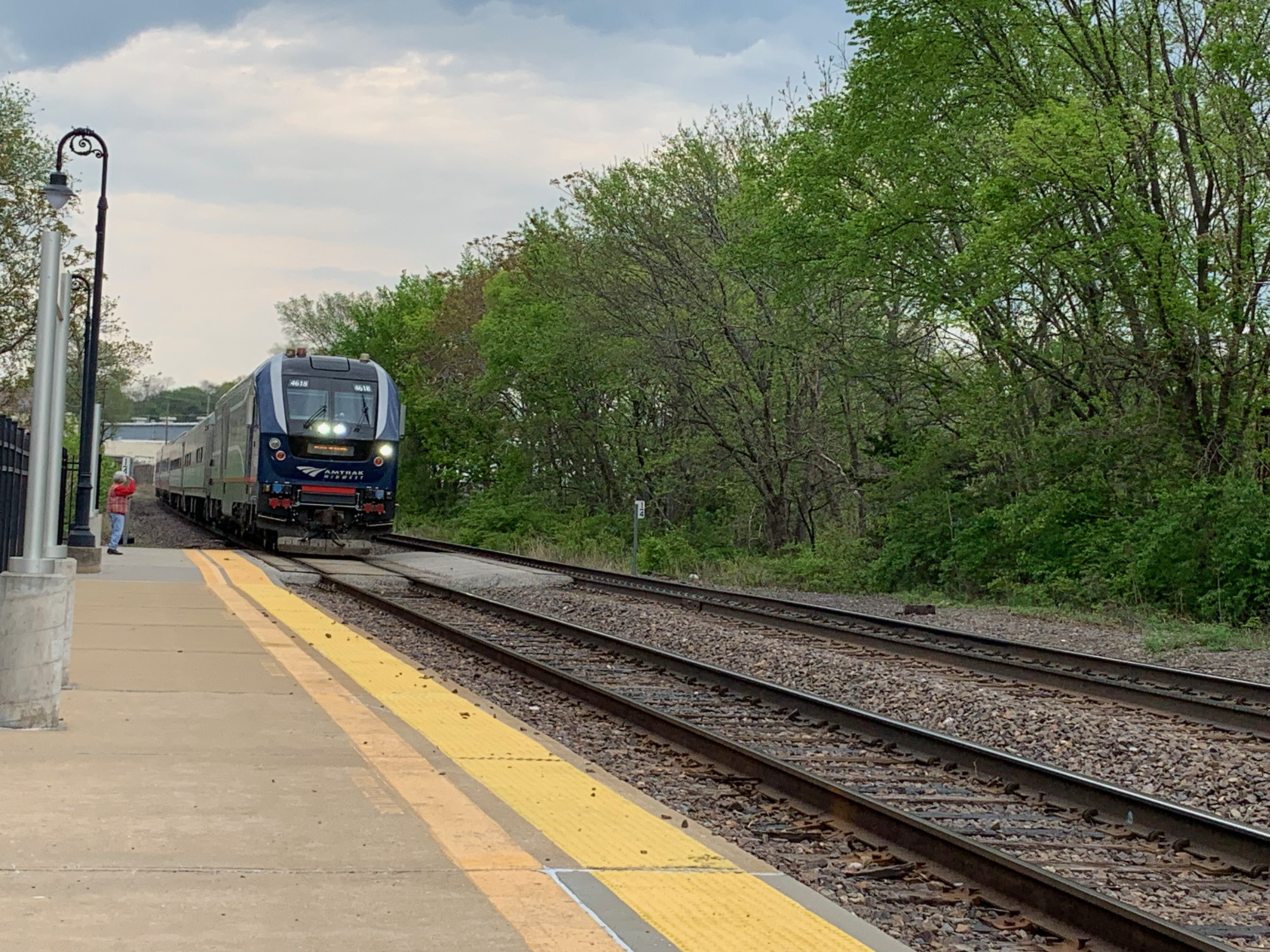 “It’s now begun to rain. Some church bells ringing. According to the Amtrak app the train is about 10 minutes out from Lee’s Summit, which is about 20 minutes down the line from here further to the southeast. Here I am, hiding underneath the overhang of the roof of this station that’s still deserted.”