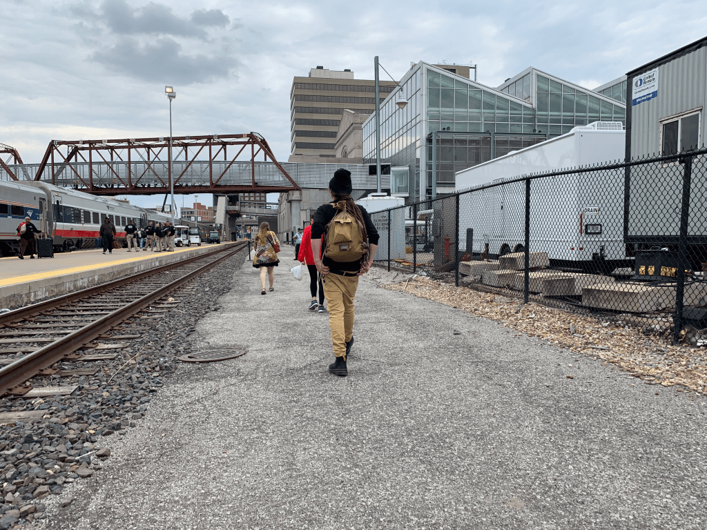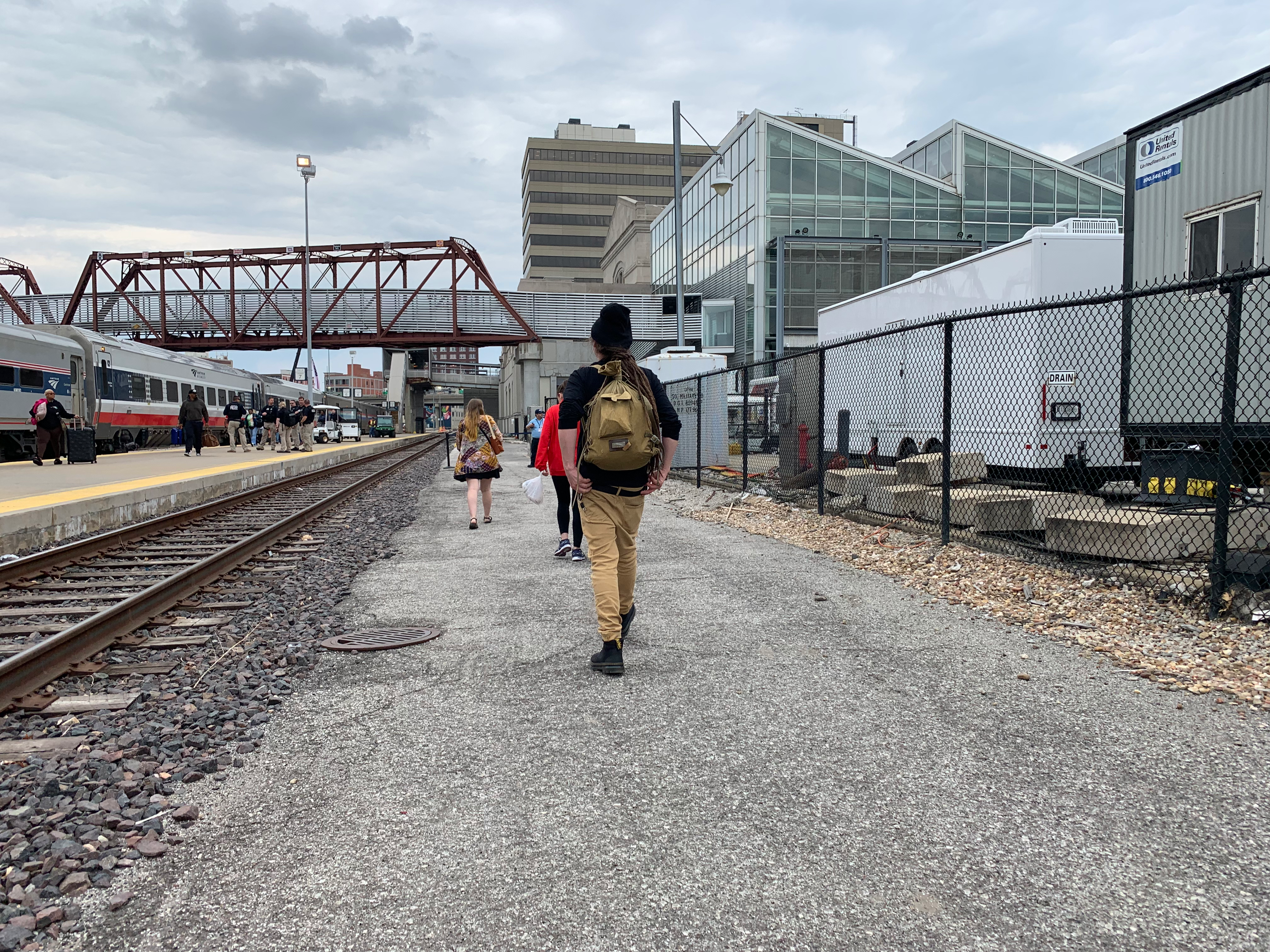 Arriving at Union Station walking from the platform to the shuttle trolley party bus