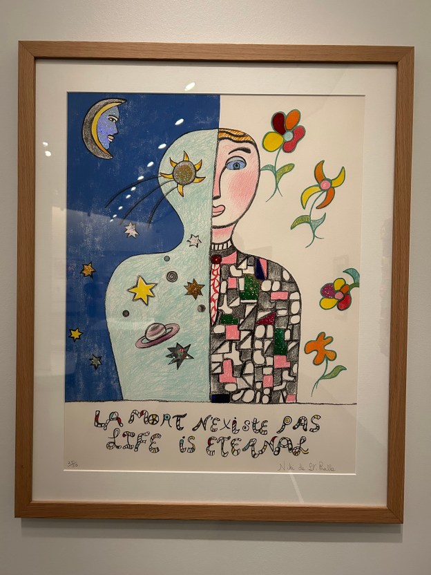 So then, perhaps what I appreciated the most about Niki de Saint Phalle’s later works was as much the longevity of their creation as it was their brilliant colors and joyous expressions. These are works which are meant to last so that generations of people will see them and perhaps in their forms feel a sense of their creator’s joy. I certainly felt that, even now 22 years after Saint Phalle’s death. I took one photo in the exhibit, of a color lithograph she made with a dualistic figure, on the one side with a human face and body and on the other the human frame surrounded by planets, moons, and stars. Beneath the dual figure Saint Phalle wrote in French and English, “La mort n’existe pas / Life is eternal.” I believe through our joy, no matter how childlike it may be, we can live on even after death. As St. Paul wrote, “Rejoice! Your kindness should be known to all.” (Phil. 4:4–9)