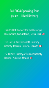 Earlier this year when I began to consider which conferences I would like to attend in Fall 2024, I knew from the start that my old stalwart of the Sixteenth Century Society would be top of the list. I was also interested in attending the History of Science Society’s conference for the first time after meeting a fair number of attendees from the 2023 meeting last year at my workshop in Brussels. Two conferences in two weeks is a fair amount of travel to undertake and money to spend. Yet there was more to be planned, for in midsummer I read a notice from the Society for the History of Discoveries about a special issue of their journal Terrae Incognitae about animals and exploration. I sent in a proposal which was accepted, leading to an outstanding offer to submit an article for the issue which I’m editing. So, knowing it would be good to meet the people of the SHD, I decided to submit a proposal to their conference as well.