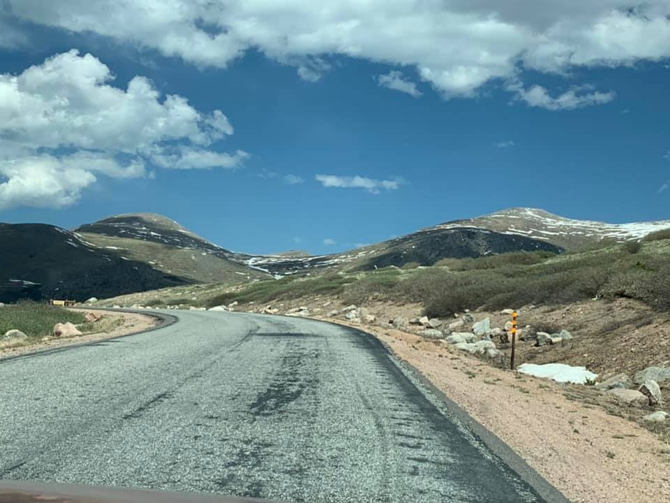 After the Glenwood Canyon, the road rises up to crest the Vail Pass at 10,666 ft (3251 m). While I haven’t gotten terrible altitude sickness for a long time, driving up this pass was one moment when I did seriously consider it on the trip. We stopped at a rest area at the top, alongside countless other travelers, most of whom wanted to take in the sights at such a high altitude, let alone of the remaining snowpack on the tops of the nearby fourteeners. While standing around there in the Sun looking at a paper map of the state given to me at the Colorado Welcome Center in Burlington a week before, I tried to find some scenic routes we could take east in to Denver that would be just long enough to give us something neat to see and do besides just drive on I-70, but not too long as to wear us out before the 8 hour drive the following day across Kansas.